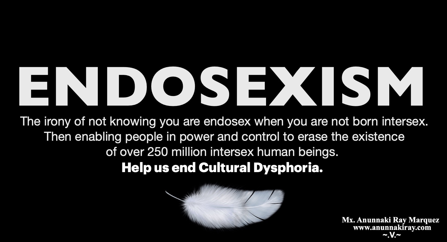 Text: Endosexism. The irony of not knowing you are endosex when you are not born intersex. Then enabling people in power and control to erase the existence of over 250 million intersex human beings. Help us end Cultural