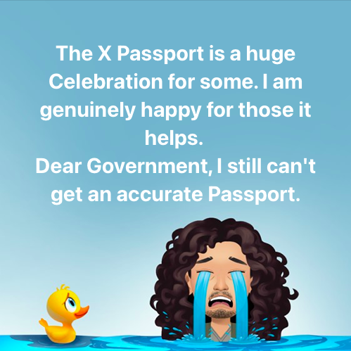 The Gender X Passport conflates our sex traits with our gender identity. This is a celebrated solution for non-binary people, some transgender people, and some intersex people. It is not a solution for all of us. It is not a solution for me.