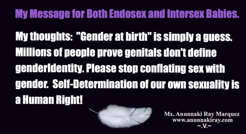 I brought the word “endosex” to the table with my TEDx Born Intersex: we are human! Intersex-born Cary G Costello, Ph.D., is one of the first to use “endosex” in his writing. I believe I am the first to use it in a public talk. You were born endosex if you were not born intersex. Both Endosex people and Intersex people can be assigned wrong at birth. Both are valid when they emancipate their true gender, too.