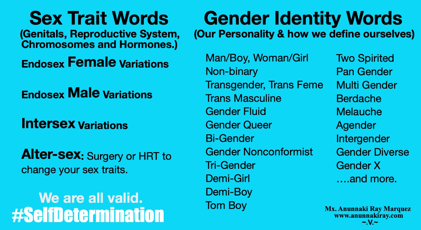 However here is my problem, and I think it is coming from my transgender intersectionality having a conflict with language that is being used by both marginalized groups of people, intersex and transgender. Many in the trans community say I identify as a man, woman, nonbinary, etc., too, as in their Gender identity. As we all know, intersex is about physiology and that an intersex person can have any gender identity, boy/man, girl/woman, both or neither, and all the ways people have discovered they can describe their gender identity. So here is my conflict with saying that I “identify as intersex.” It is conflating SEX TRAITS with GENDER IDENTITY with me.