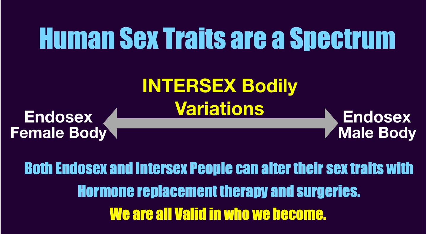 Whether a person calls themselves transgender or not, I like to say that we are all valid in our authentic gender identity, whether we require genitals or reproductive surgeries or not. Both endosex and intersex people can take hormone replacement and/or have surgeries if they find them necessary to be at peace with themselves. No intersex child should ever have genital corrective surgeries against their consent. All people deserve to live their authentic selves, and sometimes we must wait for the child to develop a voice to hear what they want or do not want. Now that non-binary and nonconforming gender identities and bodies exist, I believe it will become much easier for children to remain whole intersex people. We must confront endosexism to end these surgical tragedies and the misassignment of intersex kids. To understand even better, here is my short educational TEDxTalk: Born Intersex, we are Human!