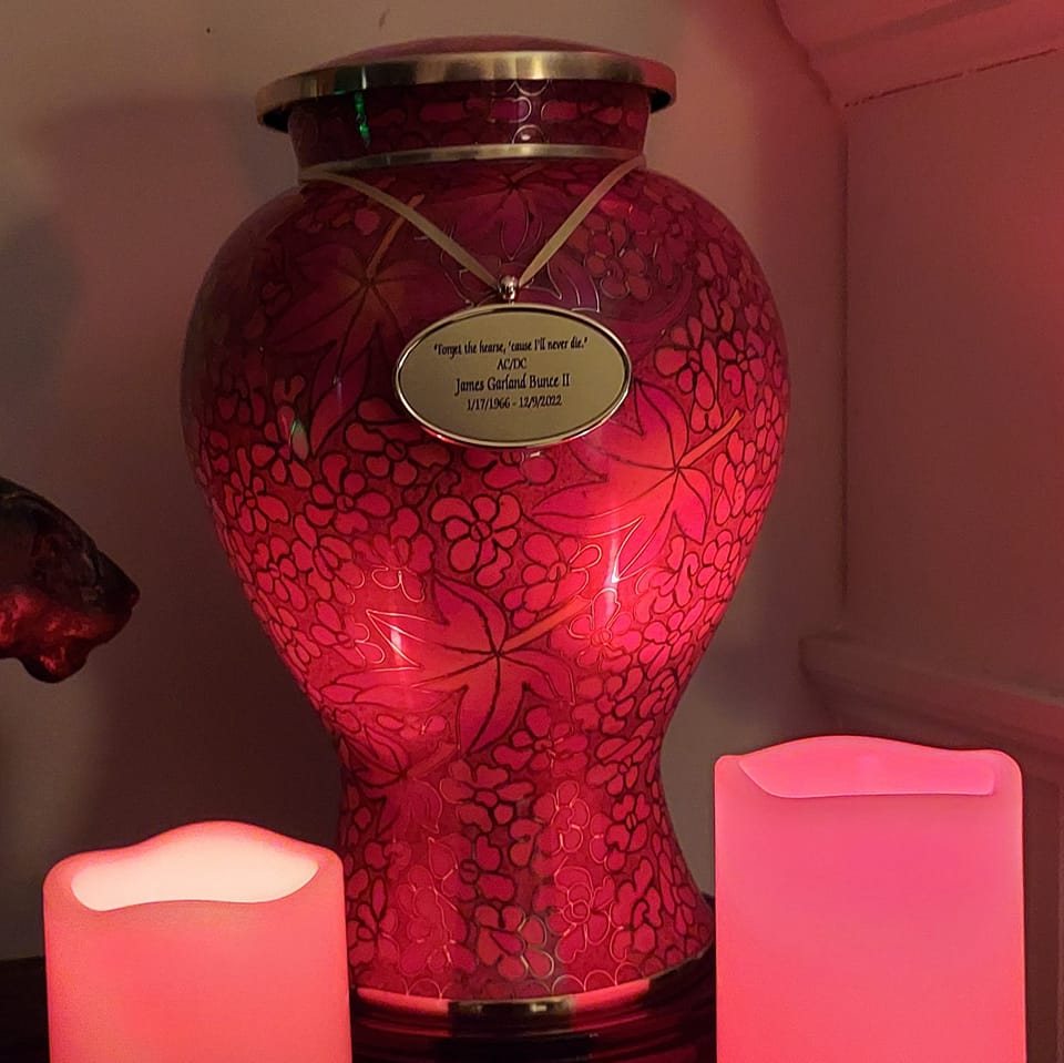 An urn that represents all the beautiful red leaves of our last walks together in the fall